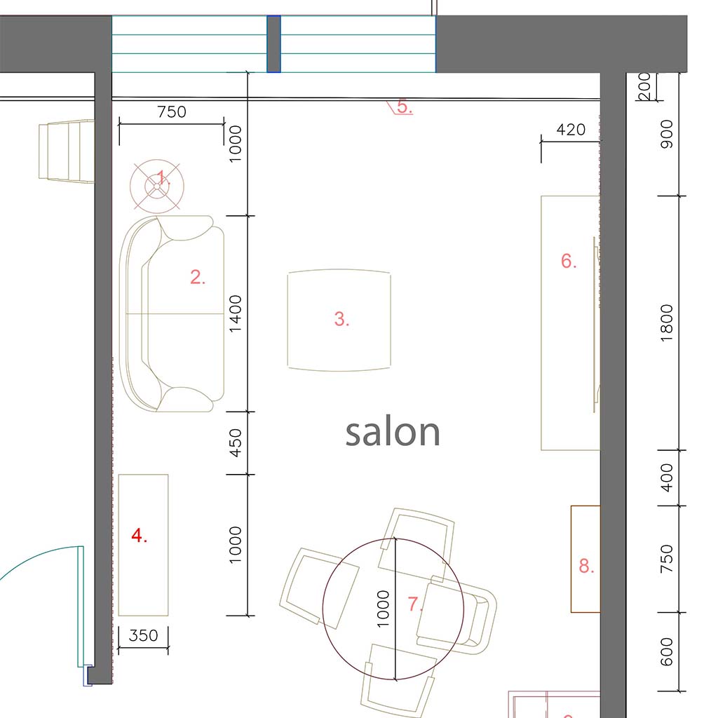 Po wybraniu ostatecznej wersji wizualnej projektu przygotuję rysunki 2D przedstawiające plany pomieszczenia, na których będą niezbędne informacje, np.: