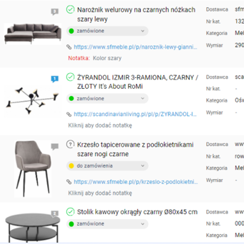 To spis proponowanych przeze mnie elementów wyposażenia wnętrza i użytych w projekcie materiałów. Lista zakupów zawiera linki do produktów lub adresy sklepów stacjonarnych.